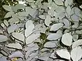 The bark is grey, with a thin corky layer. Leaves are simple and entire, often broadest at the base, 6 to 13 cm long tapering to a long point. The upper surface is green. The underside is pale, nearly white.