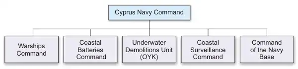 The Cyprus Naval Command (Greek: Ναυτική Διοίκηση Κύπρου, Turkish: Kıbrıs Deniz Kuvvetleri) (also known as the Cyprus Navy or Cypriot Navy) is the armed sea wing of the Cyprus National Guard. The Cypriot Navy has the primary mission of defending the maritime borders of the Republic of Cyprus, but is currently unable to access the waters around Northern Cyprus, which have been controlled by the Turkish Navy since the 1974 Turkish invasion of Cyprus. This force does not possess any capital ships or other major warships, but is equipped with patrol boats,[1] landing craft, surface-to-surface missile systems and integrated radar systems, as well as SEALs-type naval underwater demolitions units.