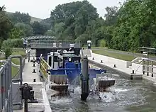 ![]() Sculler waits to enter Day's Lock while a cruiser tries to come out sideways | |