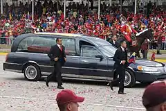 Foreign minister Elías Jaua decreed seven days of mourning for Chávez.[77] Chávez's body was taken to the Military Academy in Caracas on 6 March 2013, accompanied by large numbers of supporters who joined the procession at the military parade grounds (the Heroes Avenue) and was left lying in state for the public to visit for three days. The state funeral was held in Caracas on 8 March 2013.[1][78][79] Acting President Nicolás Maduro originally stated that Chávez's body would be embalmed and permanently displayed after the state funeral in a transparent sarcophagus at a military museum in the former site of the Military Academy in La Planicie Barracks at the 23 de Enero district west of the city proper.[80][81] However, due to difficulties in finding an expert and the uncertainties of plastination in which the weather plays a substantial part, Maduro announced that the body would not be embalmed in time.[82] President Maduro extended national mourning from 4 to 11 days to coincide with the transportation of the body to the military museum (now Museum of the Revolution) at La Planicie Barracks, which was renamed Mountain Barracks as it was, not by accident, the place which the then Army LtCol Chavez captured and used as a command centre in the brief coup of 1992, and where he uttered his famous words "Por ahora" (For now) to the press.