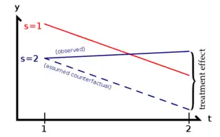 Difference in differences (DID[1] or DD[2]) is a statistical technique used in econometrics and quantitative research in the social sciences that attempts to mimic an experimental research design using observational study data, by studying the differential effect of a treatment on a 'treatment group' versus a 'control group' in a natural experiment.[3] It calculates the effect of a treatment (i.e., an explanatory variable or an independent variable) on an outcome (i.e., a response variable or dependent variable) by comparing the average change over time in the outcome variable for the treatment group to the average change over time for the control group. Although it is intended to mitigate the effects of extraneous factors and selection bias, depending on how the treatment group is chosen, this method may still be subject to certain biases (e.g., mean regression, reverse causality and omitted variable bias).