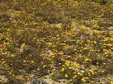 Dimorphotheca sinuata grows in western South Africa and in Namibia, very often in places receiving winter rainfall but also in sandy deserts.[8] It flowers early in spring. It is an annual sometimes exceeding 30 cm (12 inches) in height. Flower heads are generally yellow or orange with purple markings, containing both ray florets and disc florets.[9][10]