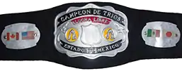 The Distrito Federal Trios Championship is a Trios (six-man) tag team Championship primarily promoted by the Mexican Lucha libre professional wrestling promotion International Wrestling Revolution Group (IWRG). The title was created in 1986 and is controlled by the "Comisión de Box y Lucha Libre Mexico D.F." (Mexico City Boxing and Wrestling Commission), which regulates all matches where the title is defended, allowing it to only be defended in Mexico City and the State of Mexico. It is considered a secondary, lower level championship than the Mexican National Trios Championship also sanctioned by the Commission but almost exclusively controlled by Consejo Mundial de Lucha Libre (CMLL). IWRG has held the control of the Distrito Federal Trios Championship since IWRG was founded in 1996 and has at times been a secondary title for the promotion, below the IWRG Intercontinental Trios Championship.[lower-alpha 3] The championship is not restricted by nationality, only by geographical location of where it can or cannot be defended.