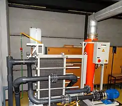 The dummy load ordinarily should be a pure resistance; the amount of resistance should be the same as the impedance of the antenna or transmission line that is used with the transmitter (usually 50 Ω or 75 Ω).[2] The radio energy that is absorbed by the dummy load is converted to heat. A dummy load must be chosen or designed to tolerate the amount of power that can be delivered by the transmitter.[3] Typically it consists of a resistor attached to some type of heat sink to dissipate the power from the transmitter.