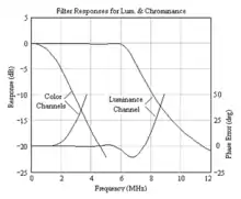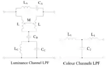 As shown below, it is beneficial, but not sufficient, to shape the luminance response to simulate that of the NTSC (PAL or SECAM) luminance characteristic (by, for example, placing an optical filter in front of the luminance tube to pass light with the required luminosity function,[5] or by a special dichroic surface which reflects light to the luminance tube with the required luminosity function[6]).
