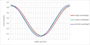 Unlike DUV lithography sources, based on excimer lasers, EUV plasma sources produce light across a broad range of wavelengths.[104] Though the EUV spectrum is not completely monochromatic, nor even as spectrally pure as DUV laser sources, the working wavelength has generally been taken to be 13.5 nm. In actuality, the reflected power is distributed mostly in the 13.3-13.7 nm range.[105] The bandwidth of EUV light reflected by a multilayer mirror used for EUV lithography is over +/-2% (>270 pm);[106] the phase changes due to wavelength changes at a given illumination angle may be calculated[107] and compared to the aberration budget.[108] Wavelength dependence of reflectance[107][105] also affects the apodization, or illumination distribution across the pupil (for different angles); different wavelengths effectively 'see' different illuminations as they are reflected differently by the multilayer of the mask.[109][105] This effective source illumination tilt can lead to large image shifts due to defocus.[110] Conversely, the peak reflected wavelength varies across the pupil due to different incident angles.[105][111] This is aggravated when the angles span a wide radius, e.g., annular illumination. The peak reflectance wavelength increases for smaller incident angles.[112] Aperiodic multilayers have been proposed to reduce the sensitivity at the cost of lower reflectivity but are too sensitive to random fluctuations of layer thicknesses, such as from thickness control imprecision or interdiffusion.[113] In particular, defocused dense lines at pitches up to twice the minimum resolvable pitch suffer wavelength-dependent edge shifts.[114]