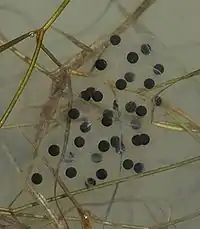 About 200-301 eggs are laid at each amplexus, and clumps of spawn contain up to 35 eggs. The minimum tadpole lifespan is 118 days, at a consist temperature of 20 °C. Metamorphosis occurs from January to March, the metamorphs resemble the adults and are very small, only 9–13 mm in length.