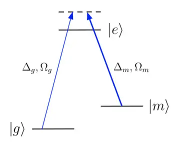 EIT has been used to laser cool long strings of atoms to their motional ground state in an ion trap.[18] To illustrate the cooling technique, consider a three level atom as shown with a ground state , an excited state , and a stable or metastable state that lies in between them. The excited state is dipole coupled to and . An intense "coupling" laser drives the transition at detuning above resonance. Due to the quantum interference of transition amplitudes, a weaker "cooling" laser driving the transition at detuning above resonance sees a Fano-like feature on the absorption profile. EIT cooling is realized when , such that the carrier transition lies on the dark resonance of the Fano-like feature, where is used to label the quantized motional state of the atom. The Rabi frequency of the coupling laser is chosen such that the "red" sideband lies on the narrow maximum of the Fano-like feature. Conversely the "blue" sideband lies in a region of low excitation probability, as shown in the figure below. Due to the large ratio of the excitation probabilities, the cooling limit is lowered in comparison to doppler or sideband cooling (assuming the same cooling rate).[19]