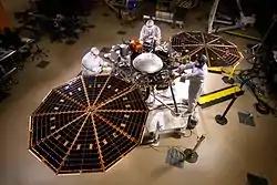 The InSight lander with solar panels deployed in a cleanroom