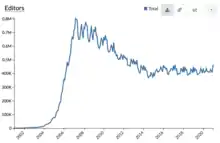 The trend analysis published in The Economist presents Wikipedia in other languages (non-English Wikipedia) as successful in retaining their active editors on a renewable and sustained basis, with their numbers remaining relatively constant at approximately 42,000.[17]