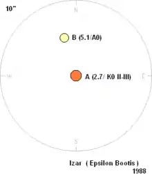 Epsilon Boötis (ε Boötis, abbreviated Epsilon Boo, ε Boo), officially named Izar /ˈaɪzɑːr/,[16] is a binary star in the northern constellation of Boötes. The star system can be viewed with the unaided eye at night, but resolving the pair with a small telescope is challenging; an aperture of 76 mm (3.0 in) or greater is required.[17]