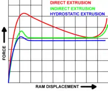 Direct extrusion, also known as forward extrusion, is the most common extrusion process. It works by placing the billet in a heavy walled container. The billet is pushed through the die by a ram or screw. There is a reusable dummy block between the ram and the billet to keep them separated. The major disadvantage of this process is that the force required to extrude the billet is greater than that needed in the indirect extrusion process because of the frictional forces introduced by the need for the billet to travel the entire length of the container. Because of this the greatest force required is at the beginning of process and slowly decreases as the billet is used up. At the end of the billet the force greatly increases because the billet is thin and the material must flow radially to exit the die. The end of the billet (called the butt end) is not used for this reason.[12]