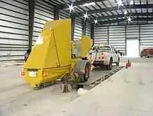 A Rolling Weight Deflectometer (RWD) is a deflectometer that can gather data at a much higher speed (as high as 55 mph) than the FWD, which allows the data to be collected without traffic control and lane closure.[8] It is a implemented as a tractor-trailer with laser measuring devices mounted on a beam under the trailer. Unlike the FWD, which pauses to make measurements, a RWD gathers deflection data while it travels.[9]