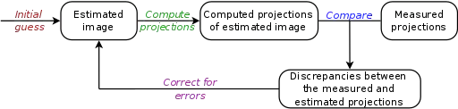 (i) The reconstruction starts using an initial estimate of the image (generally a constant image), (ii) Projection data is computed from this image, (iii) The estimated projections are compared with the measured projections, (iv) Corrections are made to correct the estimated image, and (v) The algorithm iterates until convergence of the estimated and measured projection sets.