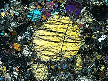 Thin section of foidolite under polarizing microscope. In the foreground there is a large yellow sodium pyroxene grain surrounded by fine grains.