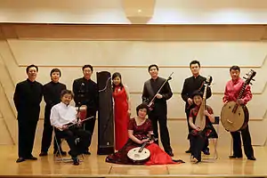 The Forbidden City Chamber Orchestra was jointly created by pipa player Yang Jing and ten musicians dedicated to traditional instruments. These are graduates of Beijing music schools such as Central Conservatory of Music and the China Music Conservatory.[1] Their repertoire includes folk love songs, songs of sorrow, songs that describe China's landscapes and recited passages.[2] Traditional instruments include the huqin and erhu which are similar to the viola and violin, the sanxian, percussion instruments, flutes and voices.[3]