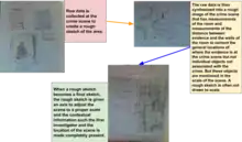 - Crime Scene Sketching: the drawing of a crime scene; in the sketch, an investigator includes measurements and dimensions to aid in displaying the layout of the scene. This helps support the information shown in photographs of the scene.[6]