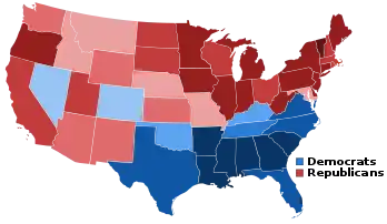 ![]() United States presidential election results between 1896 and 1928. Blue shaded states usually voted for the Democratic Party, while red shaded states usually voted for the Republican Party. | ||