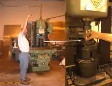 Figure 1. C-frame milling machine modified for friction extrusion. At left is an overview image and at right is a close up of the mechanical spindle which provides die rotation and the hydraulic cylinder that provides the extrusion pressure. Wire is extruded vertically through the hollow draw bar of the milling machine. This configuration corresponds to a direct extrusion with a rotating die: i.e. the charge (billet in this case) is pushed into the rotating die.