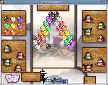 Frozen Bubble's protagonist is a penguin a la Tux, the mascot of Linux and popular feature in many free software/open-source games. In this game Tux has to shoot colored frozen bubbles to form groups of the same color. Such groups disappear and the object is to clear the whole screen in this way before a bubble passes a line at the bottom. There is a single player mode and a multiplayer mode via Split screen, LAN and Internet. The game features 100 levels and includes a level editor.[2]