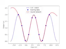 One application of machine learning is to perform regression from training data to build a correlation. In this example, deep learning generates a model from training data that is generated with the function . An artificial neural network with three layers is used for this example. The first layer is linear, the second layer has a hyperbolic tangent activation function, and the third layer is linear. The program produces parameter weights that minimize the sum of squared errors between the measured data points and the neural network predictions at those points. GEKKO uses gradient-based optimizers to determine the optimal weight values instead of standard methods such as backpropagation. The gradients are determined by automatic differentiation, similar to other popular packages. The problem is solved as a constrained optimization problem and is converged when the solver satisfies Karush–Kuhn–Tucker conditions. Using a gradient-based optimizer allows additional constraints that may be imposed with domain knowledge of the data or system.