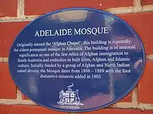 Over time, as some members of the Afghan community prospered through trade and camel breeding, they contributed towards the building of the oldest permanent mosque in Australia, the Central Adelaide Mosque in 1888–89.[21]