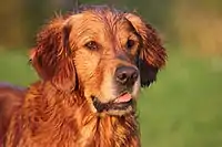 The Golden Retriever is still used as a gundog by sportsmen, both as a hunting companion in the field and for competing in field trials.[2][7][11] It is used more for retrieval of land-based gamebirds such as grouse and partridge than for wildfowl hunting.[7] Those used as gundogs are usually from working lines specifically bred for field use; dogs from pet or show lines are rarely suitable.[2][7][11] A Golden Retriever with a traditional dense double coat is well suited to working in cold and wet conditions, as the coat provides water resistance and insulation.[7][11] Compared to other retriever breeds, the Golden Retriever is not a strong swimmer; its long coat causes it to sit low in the water when swimming.[7]