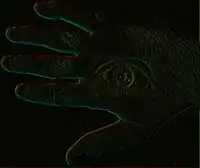 Notice that both the hand and the eye shifted color slightly in the image reconstructed from the modified gradient. This happened because the solver was set to find the entire image. However, it is possible to add constraints so that only the pasted section is solved for, leaving the rest of the image unmodified. It is also worth noting that the gradient pictured above represents the derivative of only one color channel (red), and was rendered with colors representing the strength and direction of the gradient. In practice two grayscale gradient images are found per color channel, one representing the change in x and the other representing the change in y. Each color channel is solved for independently when reconstructing the final image.
