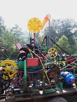 The Do-All's layout and design allows one to follow the chain reaction from machine to machine while observing the internal cogs, gears, and other components that make them work. The variety of machines include an automatically reversing worm gear, a water pump impellar, a governor/gas valve from a 20-horsepower (HP) JC engine, a blacksmith blower/bubble maker, the main line shaft and pulley from an antique corn grinder, a floating gear, a DC 110-volt generator and lights, a 38-to-1 gear reducer, a bicycle light generator, and a fan blower painted to look like a clown. Recent additions include a penny press that creates a commemorative Do-All Machine coin and a rotating satellite dish with sun and moon images painted on opposite sides.