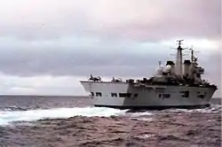 Invincible's initial air wing consisted of 801 Naval Air Squadron, equipped with five Sea Harriers and 820 Naval Air Squadron, equipped with Sea King anti-submarine helicopters.[17] In August–September 1981, Invicible took part in the NATO naval exercises "Ocean Venture" and "Ocean Safari".[7][18]