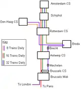 - In service as of November 2021, 11 trains per day: Amsterdam Centraal – Schiphol – Rotterdam Centraal – Antwerp – Brussels Midi – Paris Nord