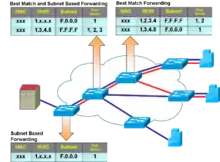 A further example (see diagram) shows HVLAN operation in the case of point-to-multipoint services (e.g. IPTV). The diagram shows all forwarding table entries needed to transport the 2 multipoint services (red and blue) from a server (left) to 3 clients (right).