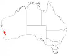 It is endemic to an area between Dandaragan and Coorow in the Wheatbelt region of Western Australia where it is found in and among breakaways growing in sandy-loamy-gravelly soils.[3] It is usually in low open heath land communities often over sandstone.[2] Although the species has a small range it is quite common within the area.