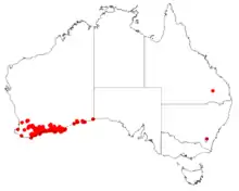 Frog hakea grows in southern Western Australia from Busselton to Eucla on sandy-loam, clay and gravel in mallee or heath.[8] An ornamental shrub, a good habitat plant for wildlife.[7]