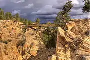 Hell's Backbone Road is a 38-mile (61 km) gravel road that was built by the Civilian Conservation Corps in the 1930s, and connects the towns of Boulder, Utah and Escalante, Utah. Halfway along the road is Hell's Backbone Bridge, which is 109 feet (33 m) long, and 14 feet (4.3 m) wide. A 1,500-foot (460 m) drop is on either side.[1] Near the bridge are views of the Box-Death Hollow Wilderness. From late spring to autumn, the road, which climbs to more than 9,000 feet (2,750 m) elevation, is passable by ordinary passenger vehicles, but it is very narrow and winding.