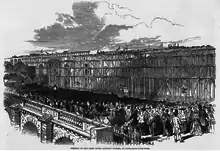 Among the company in the train were four ladies, who are deserving of honourable mention, from the courage they displayed in accompanying it, namely, Mrs Nichs. Wood, and Miss F. Wood, Mrs I. L. Bell, and her sister, Miss Pattinson of Washington. As the train passed steadily over the bridge the anxiety of the immense multitude seemed intense, and the scene was truly exciting, yet fearful—not only from the lofty eminence occupied by the train but, from the apparent narrowness and nakedness of the platform on which it rolled along. It seemed from its noiselessness, rather an aerial flight, than the rattling sweep of the iron horse.[14]