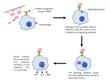 When a foreign pathogen bypasses the physical barriers and enters an organism, the PRRs on macrophages will recognize and bind to specific PAMPs. This binding results in the activation of a signaling pathway which allows for the transcription factor NF-κB to enter the nucleus of the macrophage and initiate the transcription and eventual secretion of various cytokines such as IL-8, IL-1, and TNFα.[5] Release of these cytokines is necessary for the entry of neutrophils from the blood vessels to the infected tissue. Once neutrophils enter the tissue, like macrophages, they are able to phagocytize and kill any pathogens or microbes.