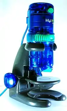 The QX3 Computer Microscope was a product in the Intel Play product line and was continued in the Digital Blue product line. The upgraded QX5 model was available.