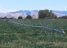 Center pivot irrigation is a form of sprinkler irrigation utilising several segments of pipe (usually galvanized steel or aluminium) joined together and supported by trusses, mounted on wheeled towers with sprinklers positioned along its length.[39] The system moves in a circular pattern and is fed with water from the pivot point at the center of the arc. These systems are found and used in all parts of the world and allow irrigation of all types of terrain. Newer systems have drop sprinkler heads as shown in the image that follows.