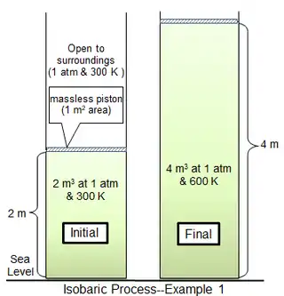 In the first process example, a cylindrical chamber 1 m2 in area encloses 81.2438 mol of an ideal diatomic gas of molecular mass 29 g mol−1 at 300 K. The surrounding gas is at 1 atm and 300 K, and separated from the cylinder gas by a thin piston. For the limiting case of a massless piston, the cylinder gas is also at 1 atm pressure, with an initial volume of 2 m3. Heat is added slowly until the gas temperature is uniformly 600 K, after which the gas volume is 4 m3 and the piston is 2 m above its initial position. If the piston motion is sufficiently slow, the gas pressure at each instant will have practically the same value (psys = 1 atm) throughout.