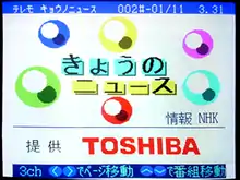 Experimental broadcasts started on October 3, 1983, by NHK in Tokyo and Osaka using the "pattern method".[6][3][5] This included subtitles and other so called "supplementary" or "independent programs", where information unrelated to the TV program being show is displayed.[7] For example, at the time of the Great Hanshin Earthquake, information about vital services and victim names was broadcast for days.[7] To accompany the introduction of the system, Sony released the "TXT-10" decoder with a cost of 119,000 yen, and Sharp released "21C-L1", a TV with a built in decoder.