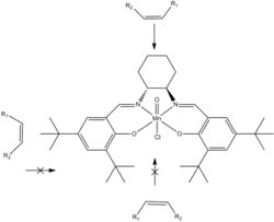The ease with which Jacobsen's catalyst selectively epoxidizes cis-alkenes has been difficult to replicate with terminal and trans-alkenes.[2] Structural changes to the ligand and adaptations to the protocol for the epoxidation reaction, however, have led to some successes in these areas.[8] For example, derivatives of Jacobsen's catalyst with small structural changes to the salen backbone have been used in conjunction with low temperatures and the oxidant m-chloroperbenzoic acid (m-CPBA) to epoxidize the terminal alkene styrene.[10] The low temperature of the reaction favors only one pathway, the cis pathway, while m-CPBA is used because of water's high freezing point. Little success has occurred with the epoxidation of trans alkenes by manganese compounds but other salen coordination compounds, such as oxochromium complexes, can be used.[8][11]