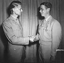 ![]() Brigadier General James McCormack, Jr, (right) is congratulated by Major General Lauris Norstad (left) after being presented with the oak leaf cluster to his Legion of Merit | |