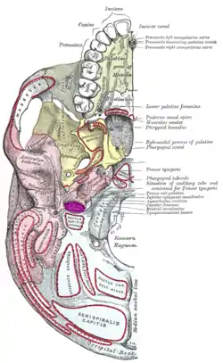 Base of the skull. Inferior surface. Jugular fossa labeled in purple near center.