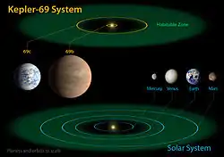 ![]() Artist's impression of the Kepler-69 system (sizes to scale) compared to the planets of the inner Solar System with their respective habitable zones. | |