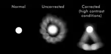 The classic symptom of keratoconus is the perception of multiple "ghost" images, known as monocular polyopia. This effect is most clearly seen with a high contrast field, such as a point of light on a dark background. Instead of seeing just one point, a person with keratoconus sees many images of the point, spread out in a chaotic pattern. This pattern does not typically change from day to day, but over time, it often takes on new forms. People also commonly notice streaking and flaring distortion around light sources. Some even notice the images moving relative to one another in time with their heartbeat. The predominant optical aberration of the eye in keratoconus is coma.[15][16] The visual distortion experienced by the person comes from two sources, one being the irregular deformation of the surface of the cornea, and the other being scarring that occurs on its exposed highpoints. These factors act to form regions on the cornea that map an image to different locations on the retina. The effect can worsen in low light conditions, as the dark-adapted pupil dilates to expose more of the irregular surface of the cornea.