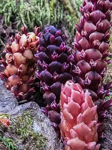 It is a parasite of salal bushes, which it parasitizes by penetrating them with haustoria to tap nutrients. The groundcone is visible aboveground as a purplish, brown, or yellowish cone-shaped inflorescence 3 to 6 cm (1.2 to 2.4 in) long. Pale-colored flowers emerge from between the overlapping bracts. Coastal aboriginal groups ate the potato-like stembase of Ground Cones raw, though usually as a snack and not in any quantity.[6]