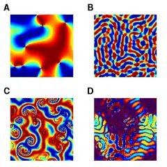 Uniform synchrony, waves and spirals can readily be observed in two-dimensional Kuramoto networks with diffusive local coupling. The stability of waves in these models can be determined analytically using the methods of Turing stability analysis.[17] Uniform synchrony tends to be stable when the local coupling is everywhere positive whereas waves arise when the long-range connections are negative (inhibitory surround coupling). Waves and synchrony are connected by a topologically distinct branch of solutions known as ripple.[18] These are low-amplitude spatially-periodic deviations that emerge from the uniform state (or the wave state) via a Hopf bifurcation.[19] The existence of ripple solutions was predicted (but not observed) by Wiley, Strogatz and Girvan,[20] who called them multi-twisted q-states.