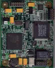 The Computer Subsystem (CSS) provided the processing power and storage capacity for the system. The CSS is based around an ARM core processor. Prior to the project's cancellation (when project funds were moved to Hurricane Katrina relief) the computer used was Techsol's Ethernet Audio Interface board,[8] powered by an s3c2410a processor from Samsung Semiconductor, featuring an ARM-920T core running at up to 200 MHz. The board included a low-power Ethernet interface using the cs8900a from Cirrus Logic, an audio interface using the internal IIS audio interface of the Samsung chip connected to an AKM integrated Audio Codec and Amplifier, a GPS receiver from Motorola, and using GPIOs for the push-buttons used for Volume UP/DOWN, and also Channel UP/DOWN. With a wide-voltage-range input power-supply, the entire wearable computer board was 2/3 the size of a business card (see photo).