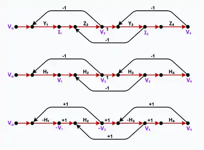 - Manipulate the signal-flow graph so that the gains feeding each summing node have the same signs. This is done as an implementation convenience. At the completion of this step, typically, all the feedback gains in the signal-flow graph will be +1 and the signs of the gain blocks in the forward path will alternate. As a result, some of the nodes, including the main output, may have a 180° phase inversion. This is usually of no consequence.[4]: 2445